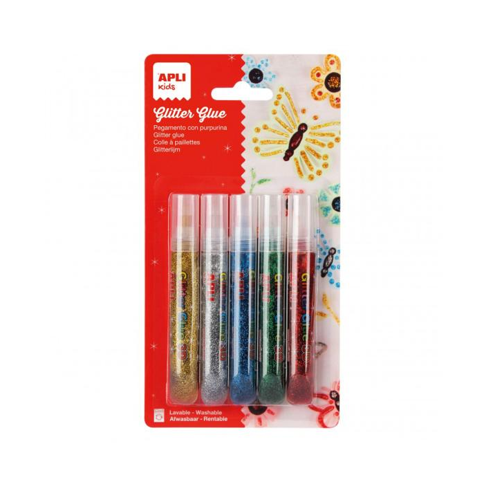 Glitrové lepidlo v rôznych metalických farbách: zlatá, strieborná, modrá, zelená a červená. Balenie obsahuje 5 injekčných liekoviek, jednu na farbu, každá po 13 g. Produkt sa ľahko používa vďaka flexibilnej fľaštičke a dávkovacej špičke, ktorá umožňuje presnejšiu aplikáciu. Ideálne na lepenie alebo zdobenie: naneste priamo na povrch, ktorý chcete ozdobiť a nechajte na vzduchu sušiť aspoň 30 minút. Odporúča sa na rôzne typy povrchov: papier, kartón, EVA pena, sklo, plast, textil, drevo alebo keramika. Veľmi čistý produkt, možno prať v práčke v programoch teplej vody
