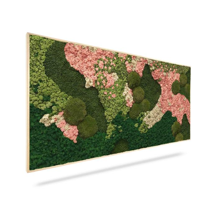 Machový obraz ORTHO PINK kombinuje viacero machov, ktoré majú rôzne farby a štruktúry. Odtiene zelenej sa krásne dopĺňajú a sú oživené o kontrastnú bledo ružovú farbu. Rôzne štruktúry vytvárajú veľmi zaujímavý dizajn, ktorý je lákadlom pre oči.