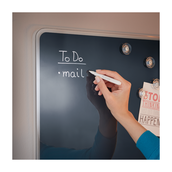Dodáva sa s čiernym popisovačom na suché stieranie, ktorý má na viečku vstavaný čistiaci kus. Magnetický popisovač drží priložený kdekoľvek na tabuli.