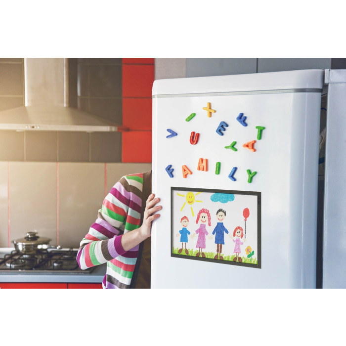 Držiak na dokumenty vo formáte A4 na pripevnenie pomocou troch magnetických pásikov na kovový podklad. Farba sivá.