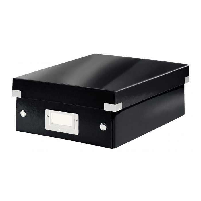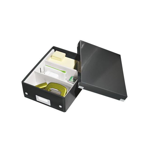 Malá štýlová skladacia krabica s vekom a s rámčekom na štítok. Na usporiadanie nabíjačiek, káblov a ďalšieho vybavenia kancelárie. Veľkosť S. Na prvý pohľad vidíte, čo sa vojde dovnútra! Výška krabice bola navrhnutá tak, aby vám poskytla dostatok priestoru na uloženie príslušenstva a zároveň zabránila skladaniu vecí na seba. Na vylepšenie usporiadania obsahu krabice použite priložený vnútorný systém priehradiek. Môžete rozdeliť krabicu na 2 alebo 3 časti a zabrániť tak miešaniu káblov alebo fotiek. Inteligentná skladacia konštrukcia: rýchle a jednoduché zloženie bez nutnosti použitia skrutiek a možnosť opätovného rozloženia na úsporu miesta, keď krabicu práve nepotrebujete. Moderný vzhľad a farby na skrášlenie vašej kancelárie alebo domova. Lesklé vyhotovenie vytvára prvotriedny vzhľad škatule a umožňuje dlhodobé používanie a jednoduché utieranie prachu. Rámček na štítok pre jednoduché označenie obsahu. Materiál pevný kartón potiahnutý polaminovaným papierom. Farba čierna.