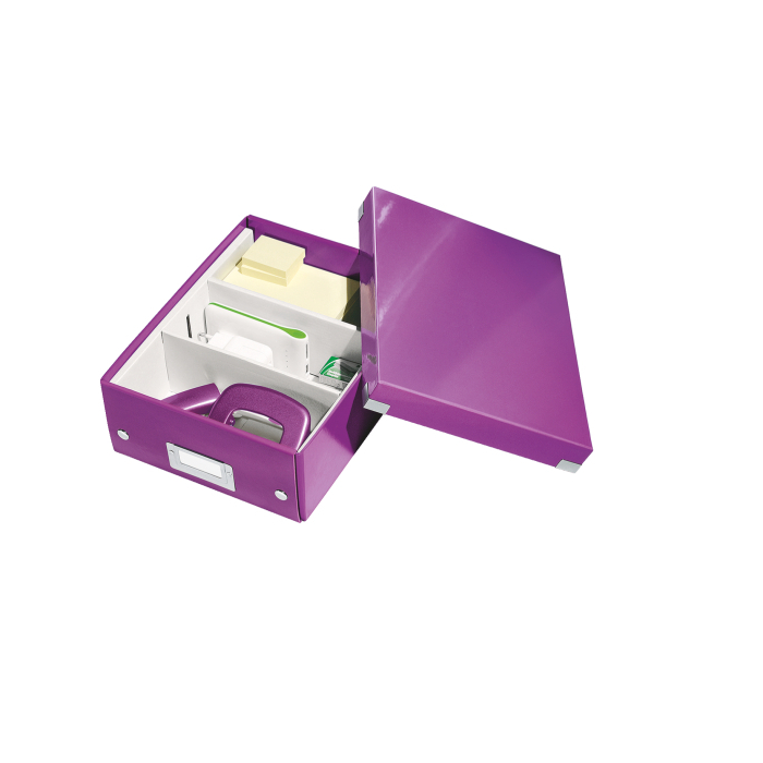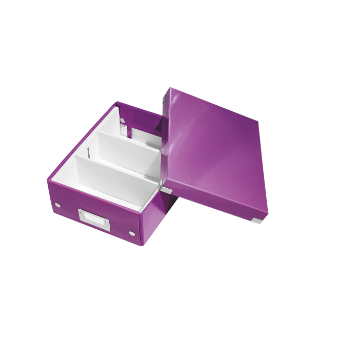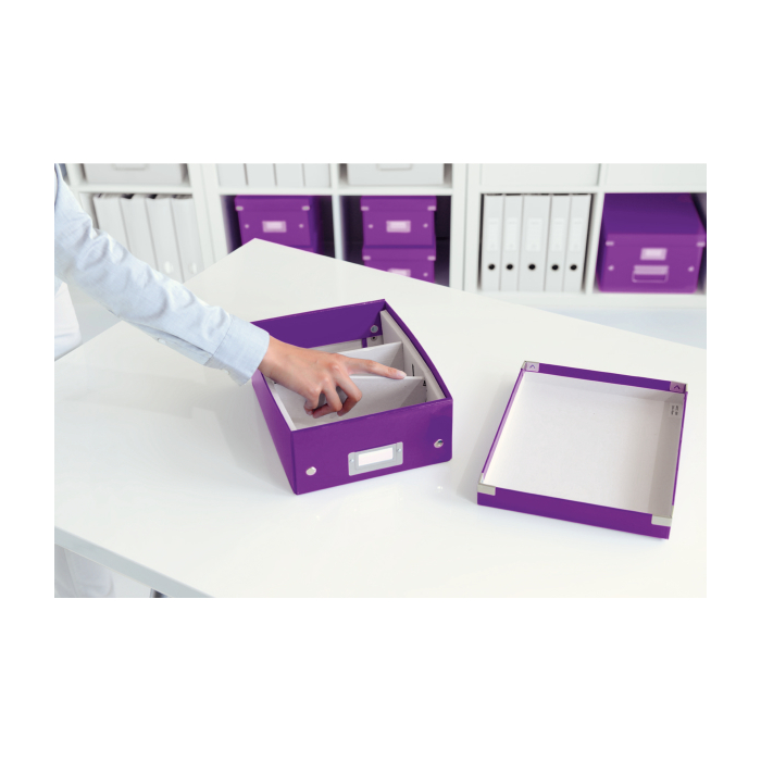 Malá štýlová skladacia krabica s vekom a s rámčekom na štítok. Na usporiadanie nabíjačiek, káblov a ďalšieho vybavenia kancelárie. Veľkosť S. Na prvý pohľad vidíte, čo sa vojde dovnútra! Výška krabice bola navrhnutá tak, aby vám poskytla dostatok priestoru na uloženie príslušenstva a zároveň zabránila skladaniu vecí na seba. Na vylepšenie usporiadania obsahu krabice použite priložený vnútorný systém priehradiek. Môžete rozdeliť krabicu na 2 alebo 3 časti a zabrániť tak miešaniu káblov alebo fotiek. Inteligentná skladacia konštrukcia: rýchle a jednoduché zloženie bez nutnosti použitia skrutiek a možnosť opätovného rozloženia na úsporu miesta, keď krabicu práve nepotrebujete. Moderný vzhľad a farby na skrášlenie vašej kancelárie alebo domova. Lesklé vyhotovenie vytvára prvotriedny vzhľad krabice a umožňuje dlhodobé používanie a jednoduché utieranie prachu. Rámček na štítok pre jednoduché označenie obsahu. Materiál pevný kartón potiahnutý polaminovaným papierom. Farba purpurová.