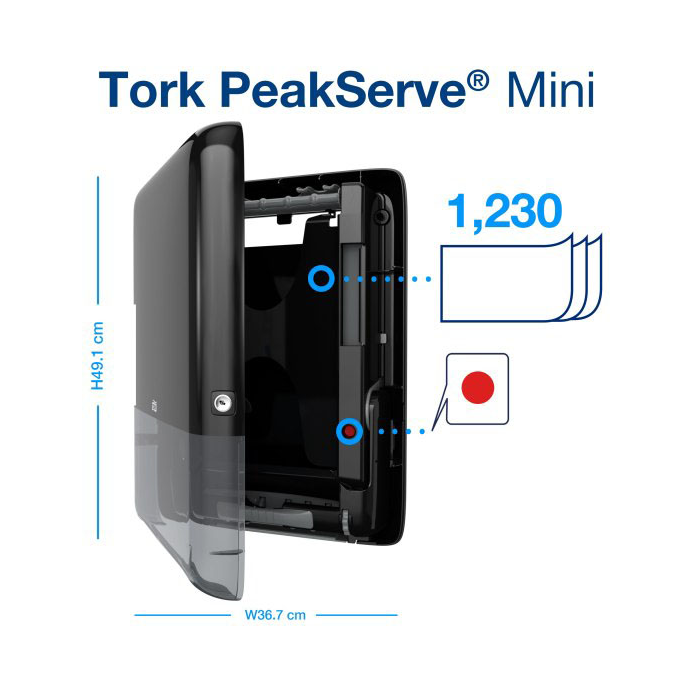 Tork PeakServe®: najnovšia inovácia navrhnutá pre vysoko frekventované toalety a umyvárne, kde personál potrebuje maximalizovať čas upratovania a udržať dobrú plynulosť pre návštevníkov. Systém je kompatibilný s nadväzujúcimi utierkami Tork PeakServe®. Má vysokú kapacitu až 1 230 utierok, ktoré dokáže dávkovať rýchlo a plynulo bez prerušenia. Stlačené náplne sa rýchlo a kedykoľvek dopĺňajú. Ľahko sa uskladňujú a prepravujú, vďaka čomu umožňujú personálu sústrediť sa na upratovanie a nie na dopĺňanie.