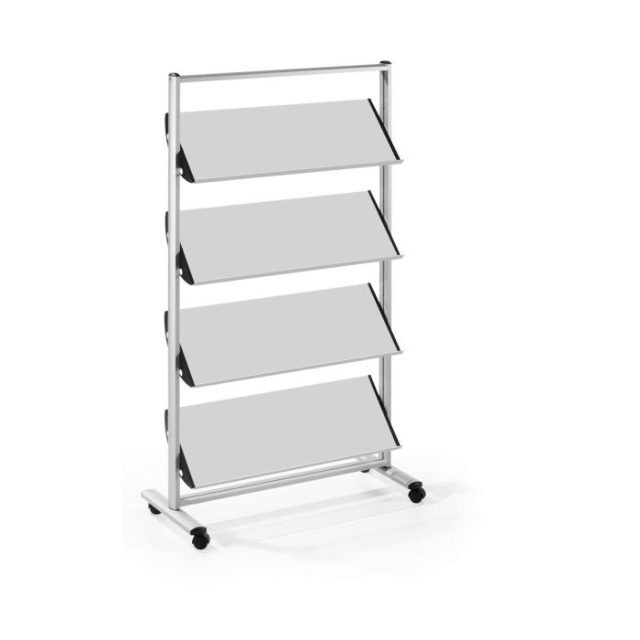 Vysoko kvalitný elegantný a pevný mobilný prezentačný stojan na časopisy alebo katalógy formátu A4. Stojan je dodávaný v rozloženom tvare. Materiál kov. Farba svetlosivá/-čierna. Štyri police s možnosťou fixácie v 3 sklonoch na max. 12×A4 formátov. Rozmery (š×v×h) 940×1760×425 mm.