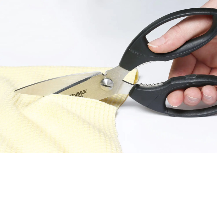 Vysokokvalitné profesionálne nožnice s precízne brúsenými čepeľami s mikro zúbkovaním a špeciálne brúseným ostrím, rukoväťou z ABS plastu a strihacou časťou z vysoko kvalitnej nehrdzavejúcej ocele. Určené na rezanie tvrdých a pevných materiálov. Nehrdzavejúce, umývateľné v umývačke riadu a farebne stály materiál pre dlhú životnosť. Každé nožnice sú ručne testované pre zaručenie maximálnej kvality. Praktická pridaná hodnota vďaka otváraču na poháre integrovanému v rukovätiach. Farba čierna. Veľkosť: 21 cm