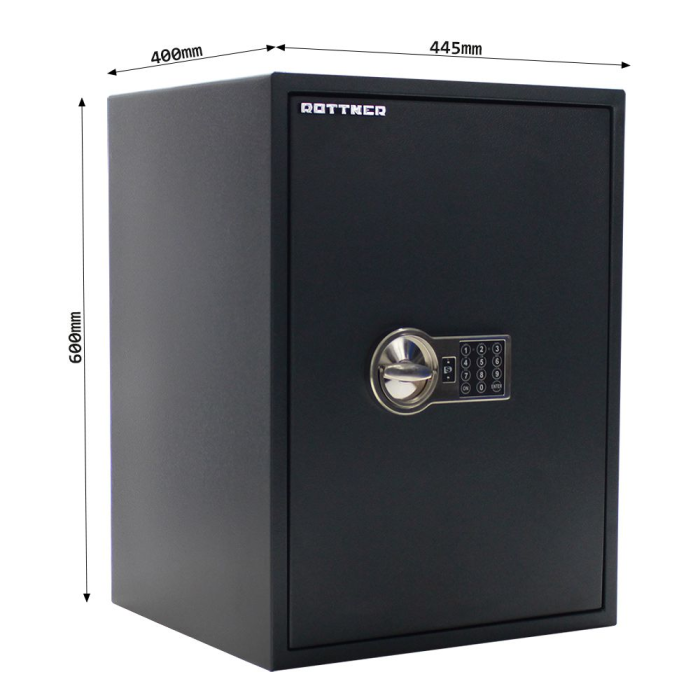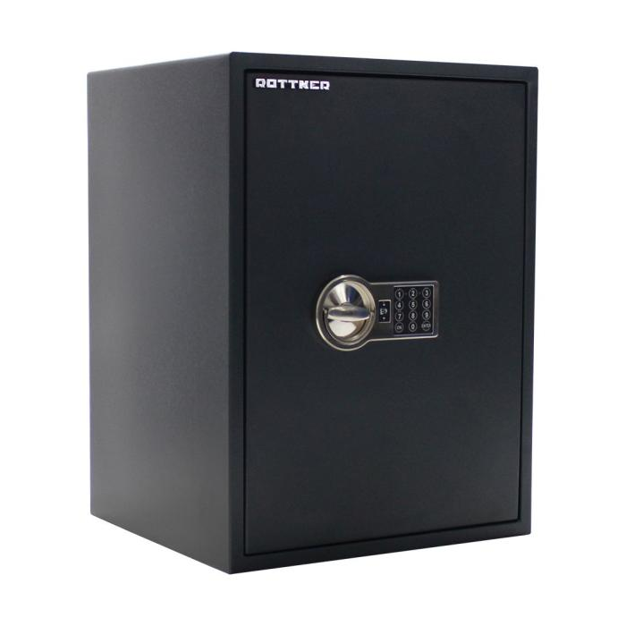 Čierny dvojplášťový trezor s certifikátom o bezpečnostnej triede S2 (ČSN EN 14450) a certifikovaným elektronickým zámkom.