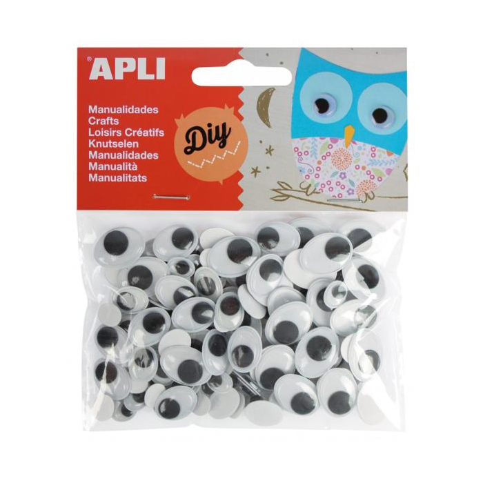 Čierne oválne nalepovacie krútiace oči. Rôzne veľkosti: 8 x 10 mm, 11 x 14 mm, 13 x 17 mm a 15 x 20 mm. Každé vrecúško obsahuje 100 očí. Oči s lepidlom na zadnej strane, pripravené na použitie. Vysoká priľnavosť na rôzne povrchy: papier, kartón, pena EVA, plast, keramika alebo sklo. Základný produkt do škôl a detských dielní, ideálny na tvorbu kostýmov, na zdobenie alebo na akúkoľvek inú ručnú prácu.