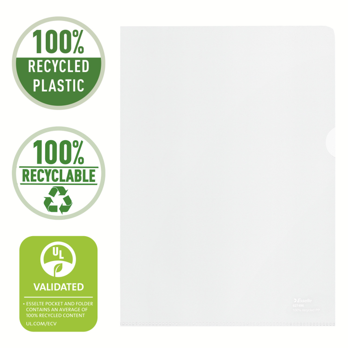 Ekologicky šetrný a opakovateľne recyklovateľný obal „L“ vyrobený v Európe zo 100% recyklovaného PP. Formát A4 s horným a pravým otváraním, ideálny na použitie v kancelárii, domácej kancelárii a v škole. Prvotriedny reliéfny povrch. Vnútorný mikrofi lm proti kopírovaniu bráni odtlačeniu textu z papiera na plast. Materiál bez obsahu kyselín chráni pred žltnutím papiera, preto je ideálny na dlhodobú archiváciu dôležitých dokumentov. Balený v 100% recyklovateľnej krabici z recyklovaného papiera.