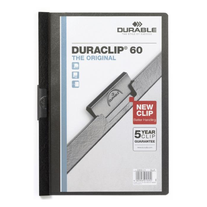 Obal vyvinutý spoločnosťou DURABLE pre viazanie nedierovaných listov. Materiál z PVC s unikátnym kovovým klipom, ktorý sa prispôsobí vloženému počtu listov a priehľadnou prednou stranou. Ideálny na prezentácie, ponuky, správy, poznámky na konferencie, semináre a pod. Formát A4. Kapacita 1-60 listov. Väčšie balenie 25 ks.