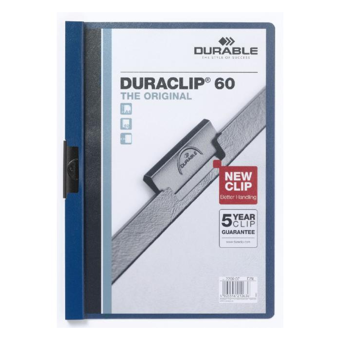 Obal vyvinutý spoločnosťou DURABLE pre viazanie nedierovaných listov. Materiál z PVC s unikátnym kovovým klipom, ktorý sa prispôsobí vloženému počtu listov a priehľadnou prednou stranou. Ideálny na prezentácie, ponuky, správy, poznámky na konferencie, semináre a pod. Formát A4. Kapacita 1-60 listov. Väčšie balenie 25 ks.