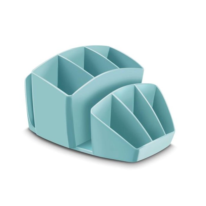 Dômyselne navrhnutý kompaktný a elegantný stolný organizér na kancelárske príslušenstvo. Kapacita: 40 pier, 5 zvýrazňovačov a 3 všeobecné priehradky. Na spodnej časti protišmyková podložka. Celkové rozmery 143 × 158 × 93 mm. 100% recyklovateľný, vysokokvalitný plast. Väčšie balenie 6 ks. Farba mentolová.