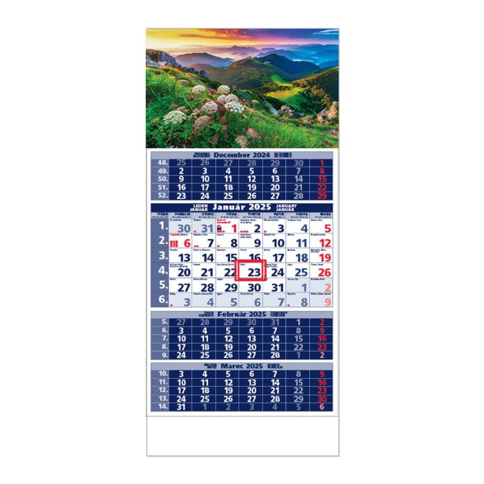 Plánovací kalendár so 4-mesačným kalendáriom s menami v SK, názvy mesiacov a dní v SK, CZ, EN, DE a HU.