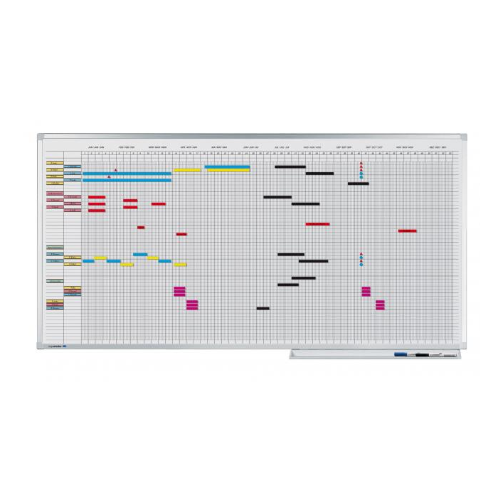 Plánovacia tabuľa s popisovateľným keramickým povrchom a s oddielmi 5-dňových týždňov je zvlášť navrhnutá pre plány, ktoré neberú do úvahy víkendové dni. V balení je sada dátumových pásikov pre bežný a nasledujúci rok.