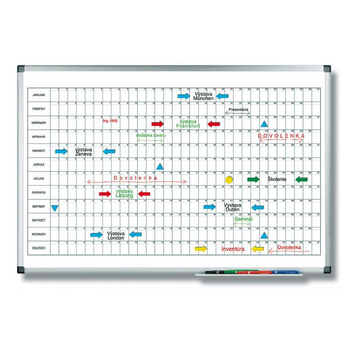 Tabuľa s popisovateľným magnetickým a špeciálne lakovaným a UV tvrdeným povrchom vo verzii ročného plánovača s názvami mesiacov dole po strane (`kalendárový` štýl). Ideálna ako `personálny plánovač`. Magnetický povrch. Sada príslušenstva zahrňuje 4 stierateľné popisovače TZ 111 a 20 mm magnetické symboly. Rozmery: 60x90 cm Veľkosť okna š x v: 25x42 mm Súčasť balenia: popisovače, symboly