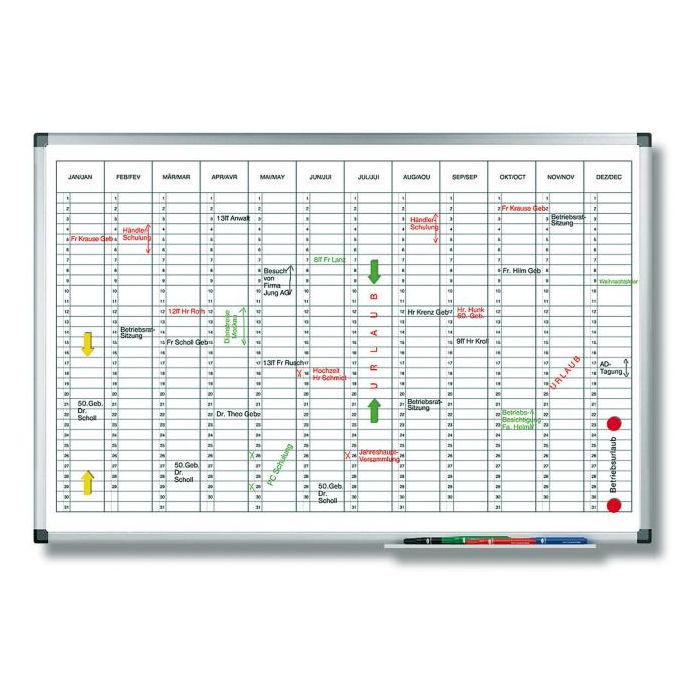 Tabuľa s popisovateľným magnetickým a špeciálne lakovaným a UV tvrdeným povrchom vo verzii ročného plánovača s názvami mesiacov v hornom riadku (`diárový` štýl). Ideálna ako `personálny` plánovač. Magnetický povrch. Sada príslušenstva zahŕňa 4 stierateľné popisovače TZ 111 a 10 mm magnetické symboly.