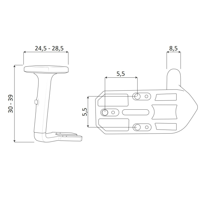 • 2D podrúčky v tvare T s inklináciou vpred o 15 o , materiál plast PP (polypropylén) • výškovo nastaviteľné s mäkkou dotykovou plochou (TPU) o rozmere 245x85 mm • zdvih 95 mm • balenie: 2 kusy • farba: čierna