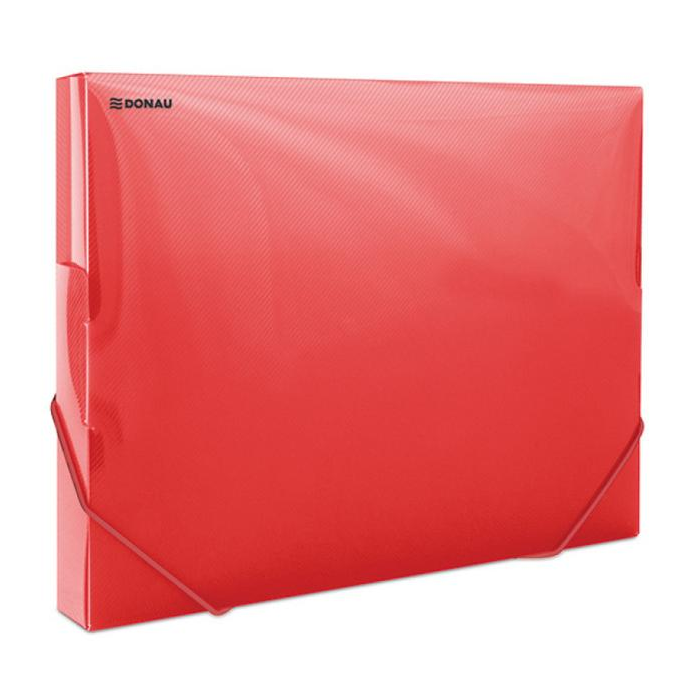 Plastový box s tromi chlopňami vyrobený zo silného polypropylénu 700 µm, uzatvárateľný gumičkou. Kapacita cca 300 listov. Rozmery (v×hך) 327×250×32 mm. Väčšie balenie 20 ks. Farba: červená