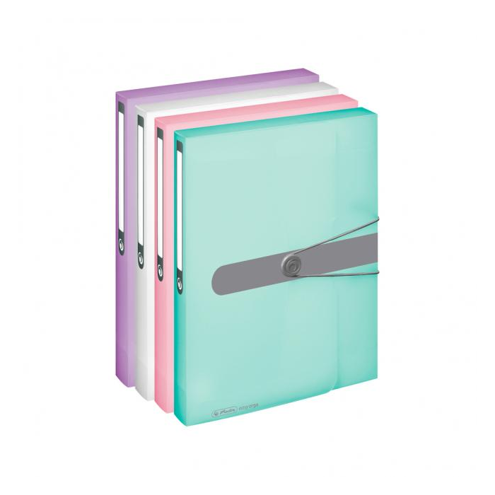 Box z polypropylénu Pastell na dokumenty formátu A4. Kapacita 400 listov, šírka chrbta 4 cm. Zatváranie sivou gumičkou o sivý plastový krúžok, nalepený chrbtový štítok na popis obsahu. Väčšie balenie 10 ks. Farba priehľadná fialová.