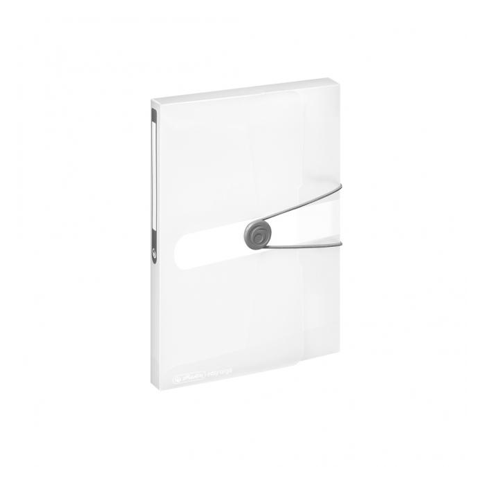 Box z polypropylénu Easy Orga na dokumenty formátu A5. Kapacita 250 listov. Zatváranie sivou gumičkou o sivý plastový krúžok, nalepený chrbtový štítok na popis obsahu. Väčšie balenie 10 ks. Farba číra.