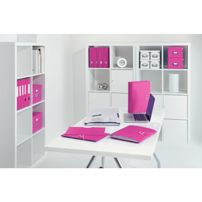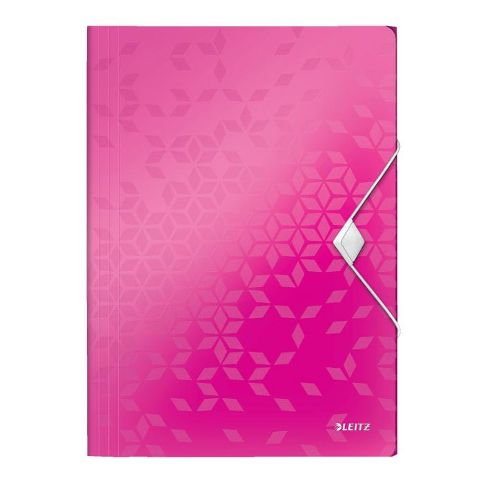 Trojchlopňový obal na dokumenty do formátu A4 z polypropylénu. V dizajne rady WOW v žiarivých farbách. Uzatváranie uchytením na gumičku. Kapacita 150 listov. Väčšie balenie 10 ks. Farba metalická ružová.