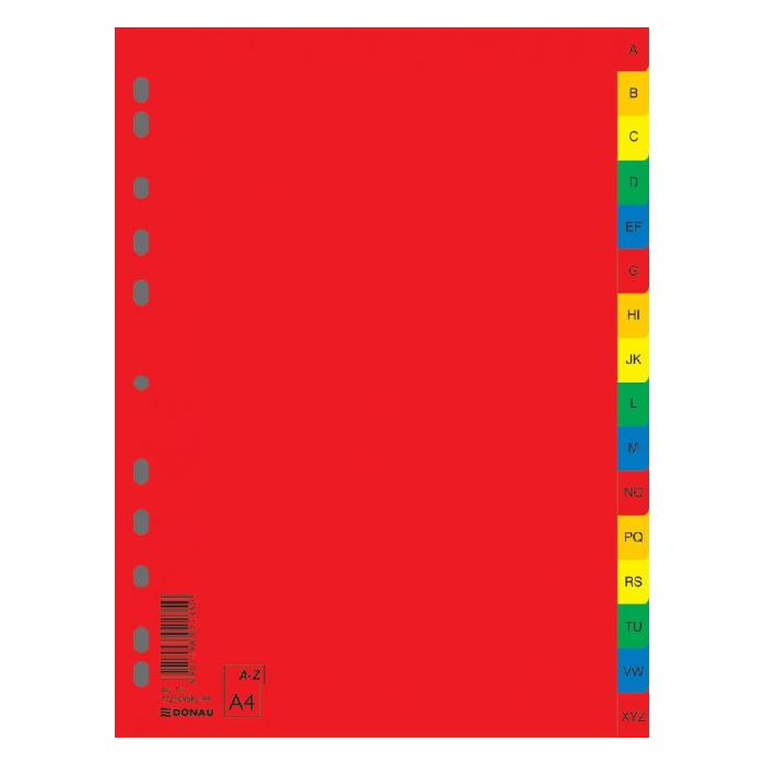 Rozraďovač formátu A4 vyrobený z tuhého polypropylénu. Jednotlivé stránky v rôznych farbách, multiperforácia na použitie rozraďovača v krúžkovom aj pákovom zakladači.Väčšie balenie 20 sád.