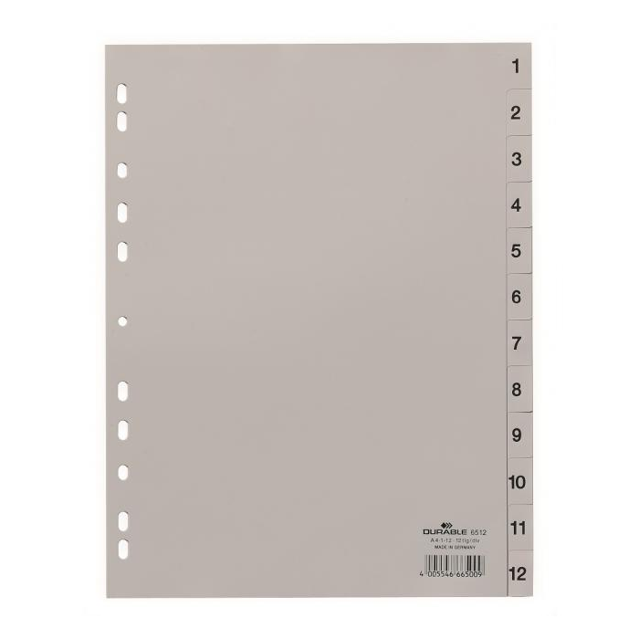 Číselný rozraďovač z polypropylénu. Formát A4, euro-dierovanie. Balenie jedna sada v polyesterovom sáčku. Väčšie balenie 25 sád. Farba sivá. Farba: sivá Formát: A4