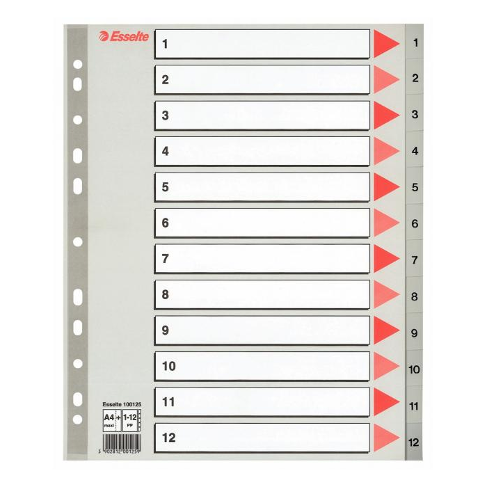 Číselný rozraďovač z polypropylénu. Eurodierovanie, popisovateľný kartónový titulný list na ľahkú orientáciu v dokumentoch. Formát A4 maxi rozmerov 245×297 mm umožňuje rozlíšenie dokumentov založených v zakladacích obaloch. Balenie jedna sada v po­lyesterovom sáčku. Väčšie balenie 10 sád. Farba sivá.