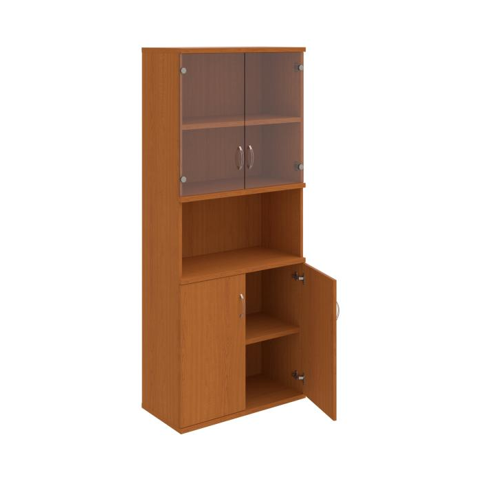 Kombinovaná skriňa - dvere/nika. Kancelárske skrine STRONG majú robustnú konštrukciu a vyššiu nosnosť políc ako bežné kancelárske skrine.V ponuke sú skriňové moduly s výškou 185 cm, 111 cm alebo 74 cm a šírky 80 cm alebo 40 cm. Hĺbka všetkých modelov skriňového radu STRONG je 40 cm.Chrbát, vyrobený z 8 mm hrubých dosák, je obojstranne pohľadový, takže skrine môžete použiť ako priestorový deliaci prvok. Hrúbka samotných políc je 25 mm, čo znamená nosnosť 80 kg na 1 policu.Korpusy, dvierka a police skríň sú olepené odolnou 2mm ABS hranou, ktorá garantuje dostatočnú ochranu proti poškodeniu.