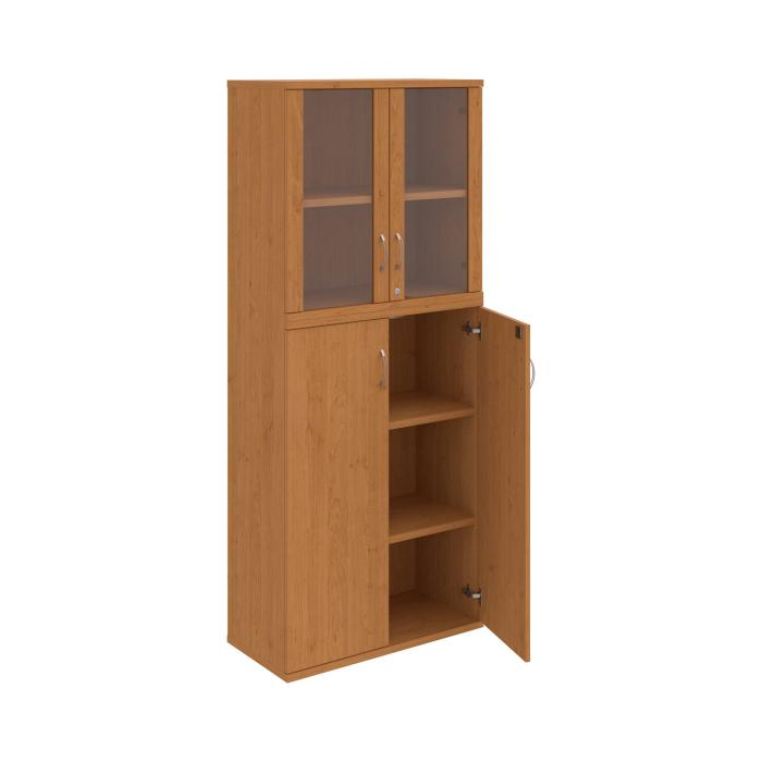 Kombinovaná skriňa - dvere/nika. Kancelárske skrine STRONG majú robustnú konštrukciu a vyššiu nosnosť políc ako bežné kancelárske skrine.V ponuke sú skriňové moduly s výškou 185 cm, 111 cm alebo 74 cm a šírky 80 cm alebo 40 cm. Hĺbka všetkých modelov skriňového radu STRONG je 40 cm.Chrbát, vyrobený z 8 mm hrubých dosák, je obojstranne pohľadový, takže skrine môžete použiť ako priestorový deliaci prvok. Hrúbka samotných políc je 25 mm, čo znamená nosnosť 80 kg na 1 policu.Korpusy, dvierka a police skríň sú olepené odolnou 2mm ABS hranou, ktorá garantuje dostatočnú ochranu proti poškodeniu.