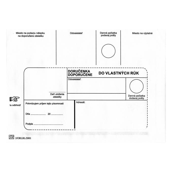 Biele papierové poštové obálky B6 s doručenkou do vlastných rúk - bez opakovaného doručenia rozmerov 125 × 176 mm s okienkom, popisom a lichobežníkovou klopou, 90 g/ m2. Balenie obsahuje 1000 ks.