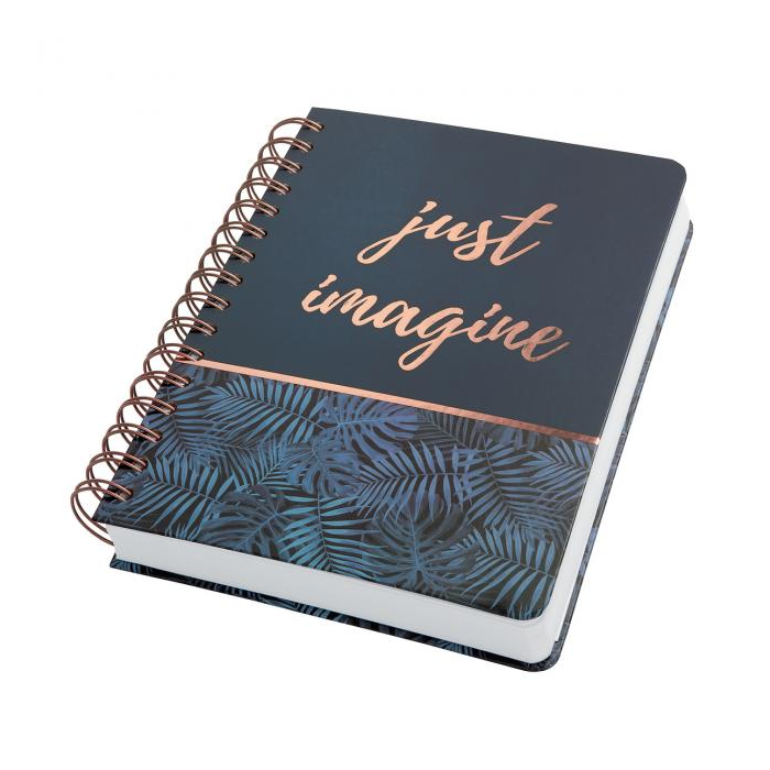 Moderný poznámkový blok s drôtenou špirálou na dlhšej strane a pevnými doskami. 240 strán formátu cca A5 (13,5 x 20,3 cm), bodkovaný podklad, papier gramáže 120 g s mikroperforáciou a certifikátom FSC aj pre písanie atramentom, zaoblené rohy.