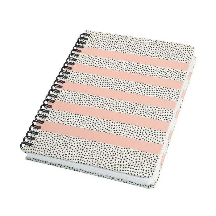 Moderný poznámkový blok s drôtenou špirálou na dlhšej strane a pevnými doskami. 120 strán formátu cca A5 (13,5 x 20,3 cm), bodkovaný podklad, papier gramáže 100 g s mikroperforáciou a certifikátom FSC aj pre písanie atramentom, zaoblené rohy.