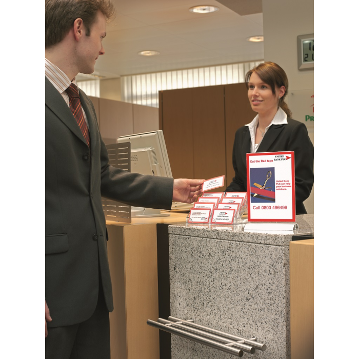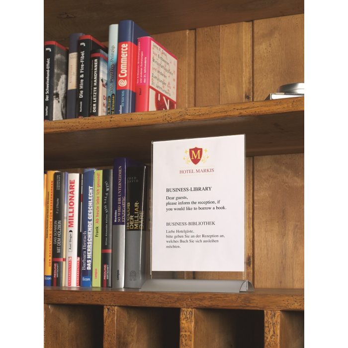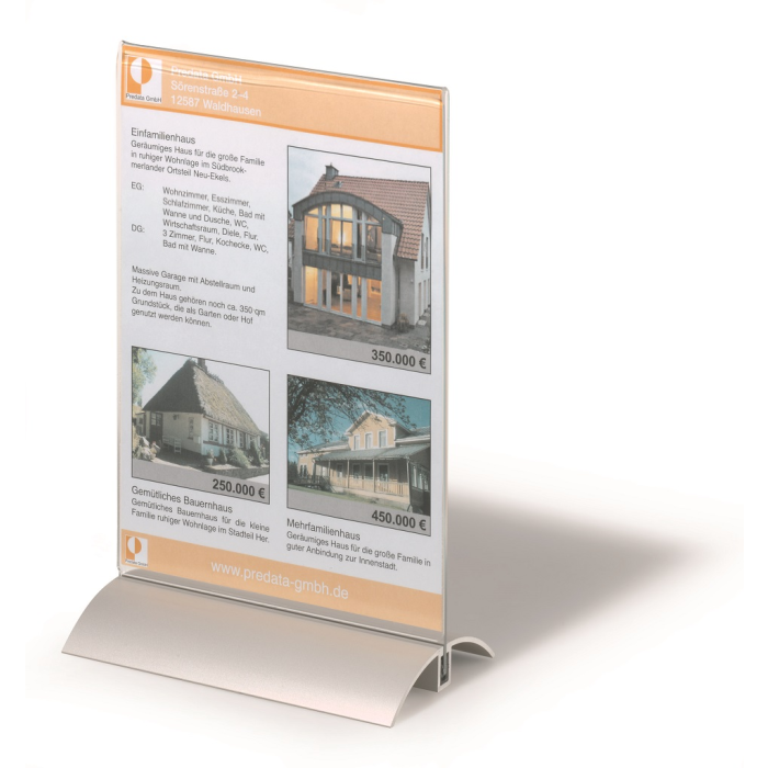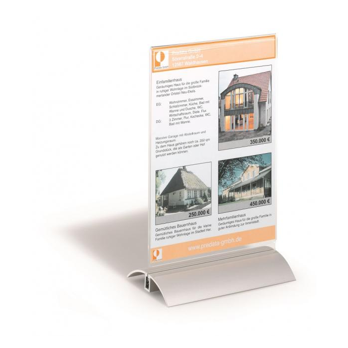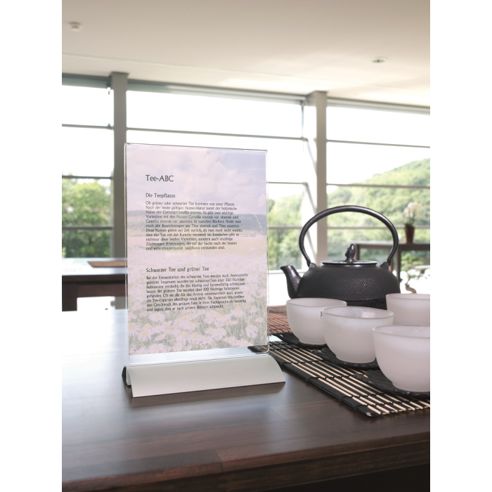 Stojan vhodný na prezentáciu ľubovoľných informácií s dobrou stabilitou. Vrchná časť vyrobená z kvalitného číreho akrylu, elegantný podstavec z hlíníka. Rozmery: 150x237x85 mm
