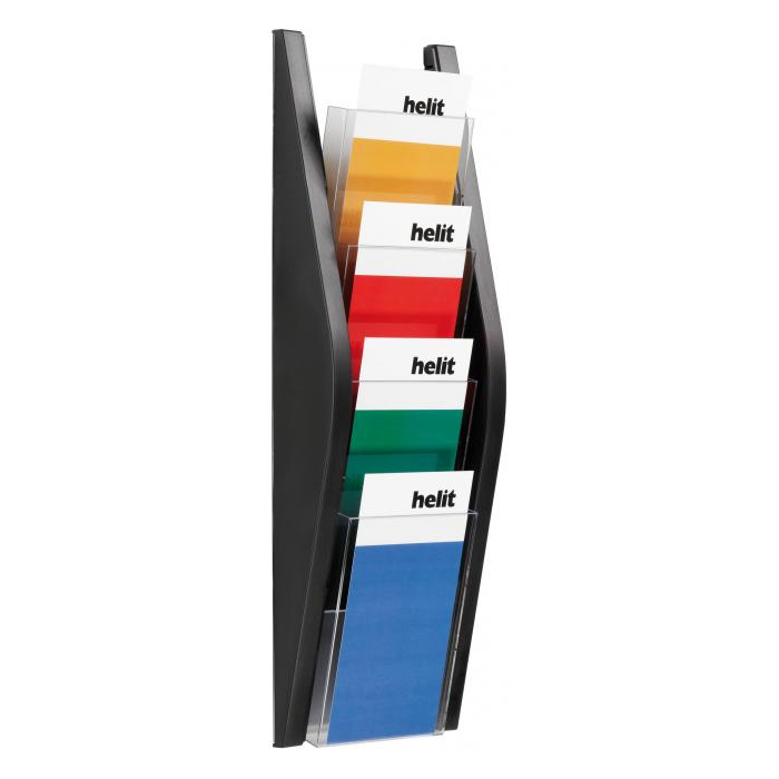 Nástenný stojan na prezentáciu materiálov. Štyri priehľadné priehradky slúžia na umiestnenie materiálov formátu 1/3 A4. Materiál kvalitný plast. Rozmery (š x v x h) 165 x 540 x 80 mm. Farba čierna.