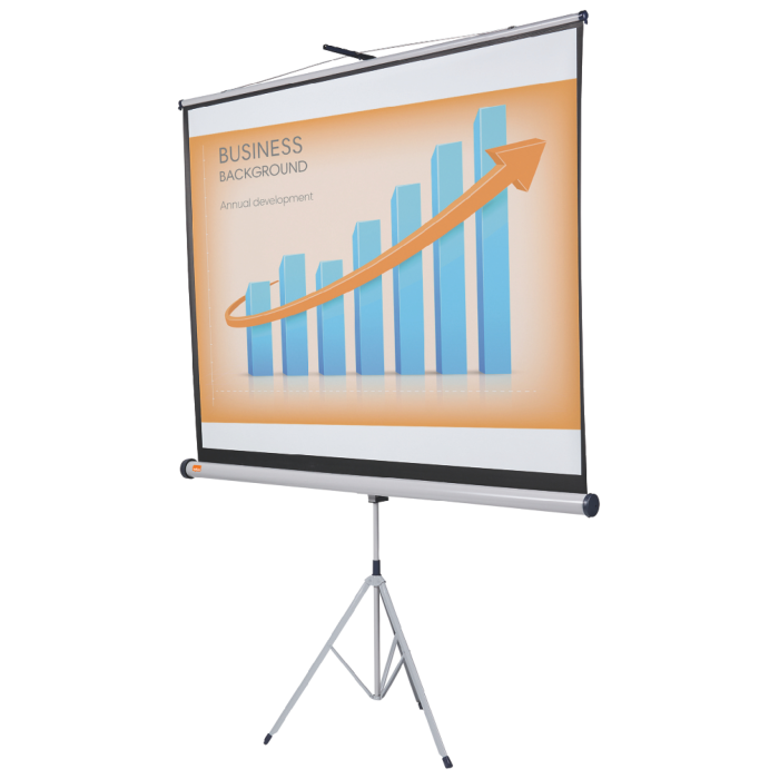 Široká škála veľmi kvalitných, univerzálnych projekčných plátien na trojnohom stojane. Žiarivý matne biely povrch plátna s čiernym okrajom zaručuje ostrý, podrobný obraz, ktorý zreteľne uvidia všetci diváci. Dá sa ľahko zasunúť do puzdra, aby bolo chránené pred poškodením. 2000 × 1513 mm.