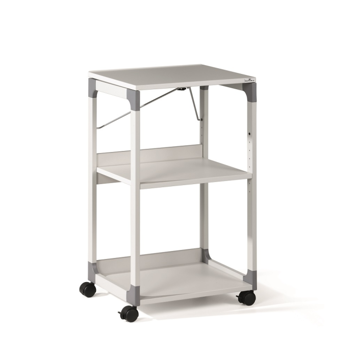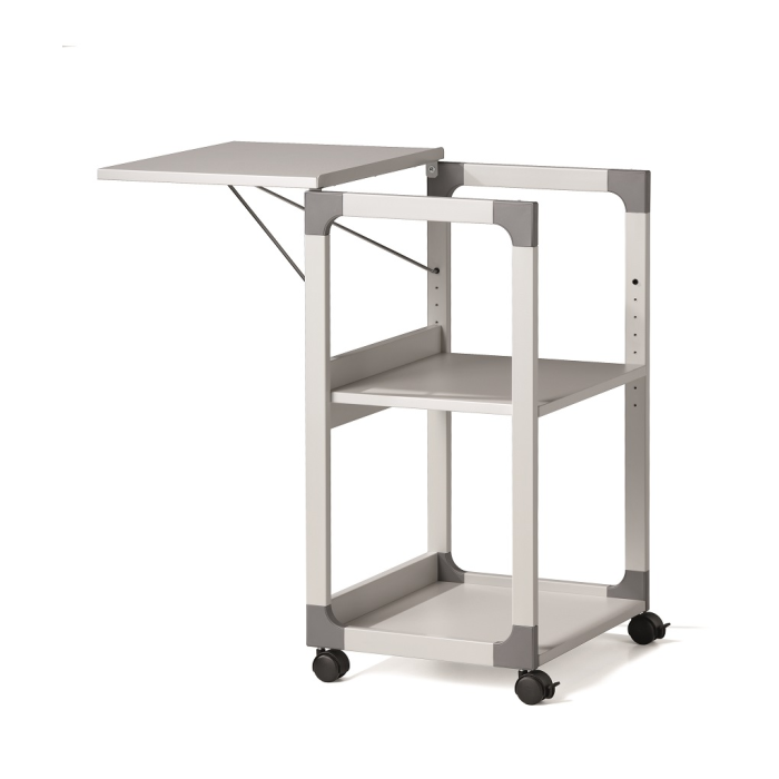 Mobilný projekčný vozík s tromi policami. Horná polica je odnímateľná a pri projekcii sa dá naklopiť do 180°, stredná polica je výškovo nastaviteľná po 32 mm, spodná polica je fixná. Hrúbka políc 19 mm. Materiál pevný kovový lakovaný rám s rohovými spojkami z plastu. Farba sivá. Rozmery š × v × h 508 x 882 x 432 mm.