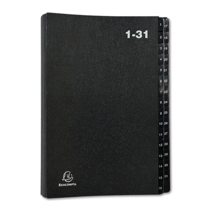 Pultová triediaca kniha na triedenie dokumentov presahujúcich veľkosť A4 do rozmerov 235 × 335 mm. Plastový poťah a rozťahovateľný chrbát. Oddiely 1-31. Farba čierna. Oddiely: 1-31