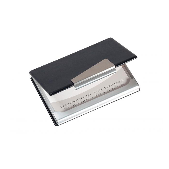 Elegantná krabička na vizitky a magnetické karty, vyrobená z vysokokvalitnej kombinácie hliníka a imitácie kože. Poskytuje bezpečné skladovanie a dokonalú ochranu až pre 20 vizitiek max. rozmerov 90 × 58 mm. Vonkajšie rozmery (š × h × d) 95 × 65 × 12 mm.. Farba čierna. Kapacita 20 vizitiek.