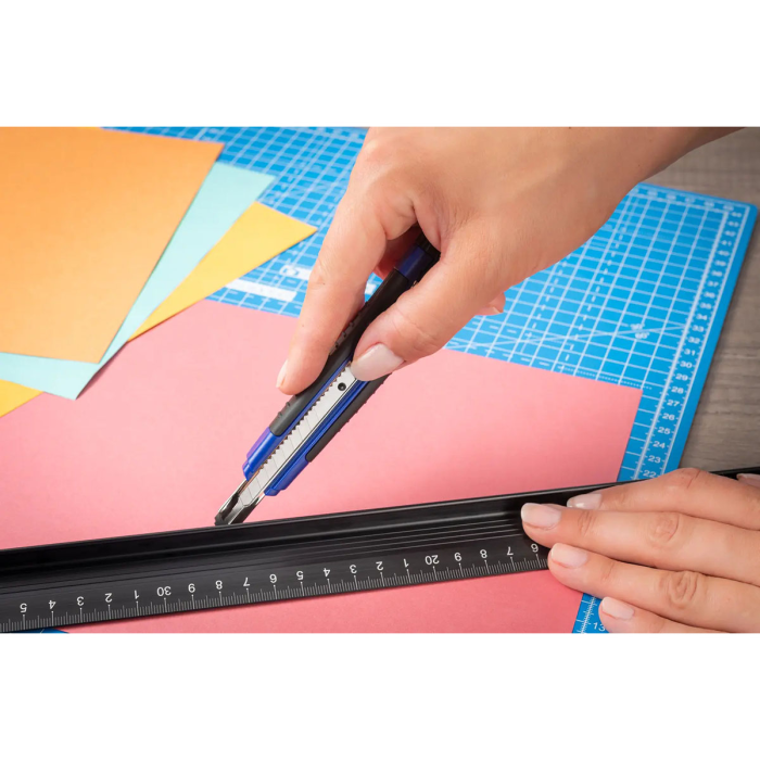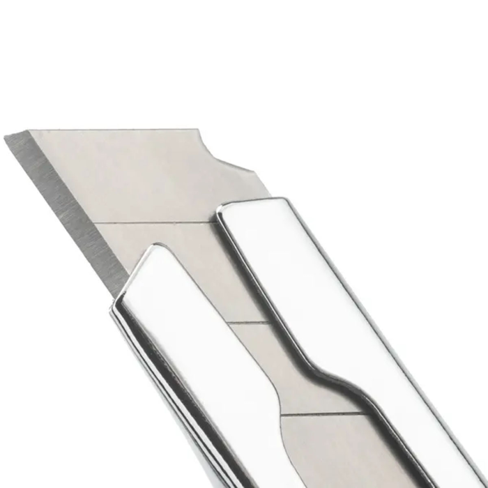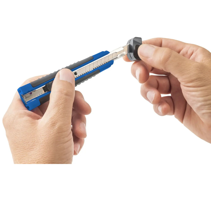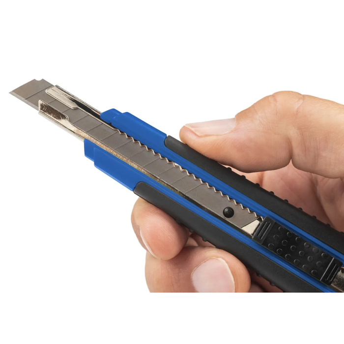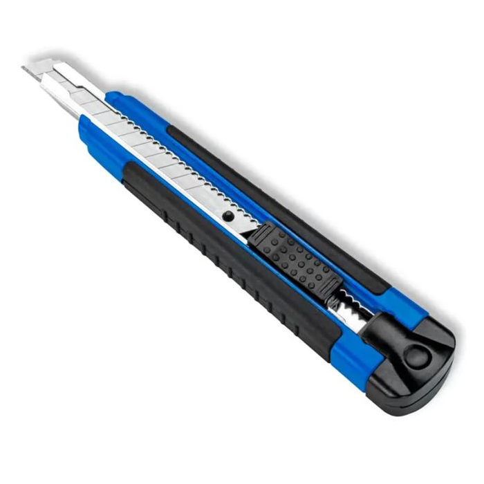 Protišmykový univerzálny rezač na rýchle a ostré rezy s odlamovacím nožom, kovovou čepeľou a aretáciou. Profi model stredný so šírkou čepele 9 mm má nôž rozdelený na 12 častí. Vďaka integrovanej funkcii odlamovania čepele v rukoväti budete mať vždy ostrú čepeľ. Rezač perfektne a bezpečne padne do ruky vďaka ergonomicky tvarovanej gumenej rukovätiModel je dodávaný s 1 nožom a s 2 náhradnými čepeľami navyše.