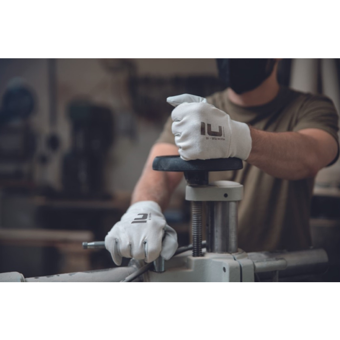 Rukavice šité z jemnej lícovej ovčiny v dlani, bielej bavlnenej tkaniny na chrbte a s nápletom.