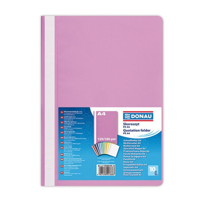 Štandardný polypropylénový rýchloviazač s priehľadnou prednou stranou a nasúvacím popisným pásikom. Formát A4. Balenie 10 ks.