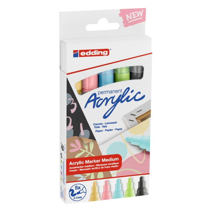 Akrylový popisovač na maľovanie na svetlé alebo tmavé povrchy, ideálny na materiály ako plátno alebo maliarsky papier. Šírka stopy okrúhleho hrotu je 2-3 mm. Vysoko kvalitná pigmentovaná akrylová farba na báze vody je po zaschnutí permanentná, nepriehľadná, svetlostála a bez zápachu. Súprava obsahuje pastelovožltú, pastelovomodrú, pastelovozelenú, klasickú slezovú a antracitovú farbu. Dodávaný v kvalitnom, znovu použiteľnom puzdre. Vhodné náhradné hroty (edding 5100 náhradné hroty) sú dostupné. Sada 5 kusov. Farba pastelový mix.