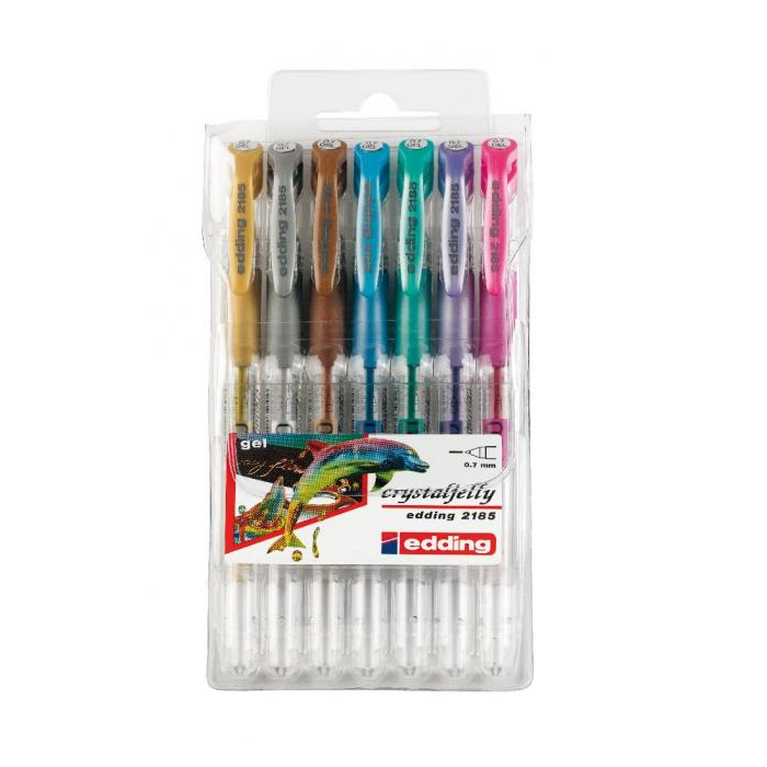 Jednorazový roller edding 2185 crystaljelly v metalických farbách gélu, ktoré vyniknú najmä na tmavom papieri vďaka vynikajúcej krycej schopnosti. Šírka stopy 0,7 mm. Sada 7 metalických farieb.