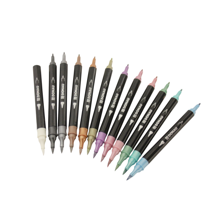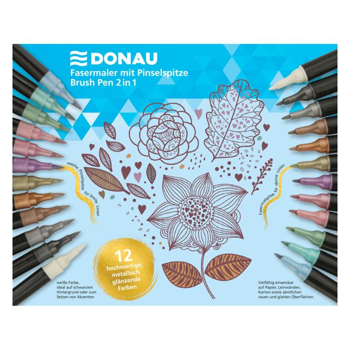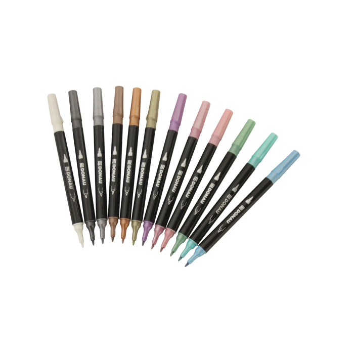 12 kvalitných metalických fixiek s dvojitým hrotom - jemný hrot na presné línie a mäkký štetcový hrot na široké ťahy či vyfarbovanie. Vhodné na rôzne kreatívne techniky - od písania a kreslenia po dekorovanie.