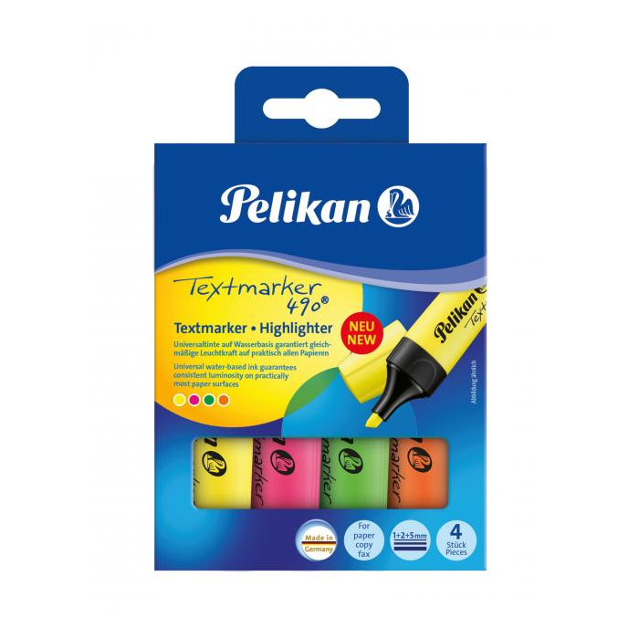 Sada štyroch zvýrazňovačov Pelikan 490 osadený klinovým hrotom so šírkou stopy 1 - 5 mm. Plnený atramentom na vodnej báze, vhodným na všetky druhy papierov, odolný voči vysychaniu. Balenie v krabičke. Farba mix.