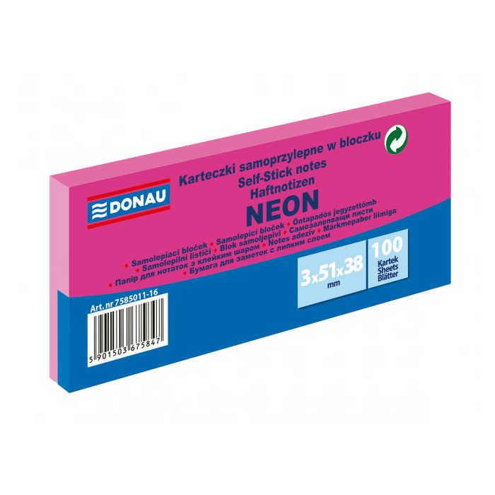 Univerzálne neónové samolepiace bločky z papiera gramáže 70 g / m², 100-lístkové, jednotlivo balené. Lepidlo nanesené po dlhšej strane, zmývateľné vodou. Udelený Green Point. 3 bločky vo fólii s červeným pruhom na uľahčenie otvárania. Väčšie balenie 36 ks. Farba neónovo ružová.