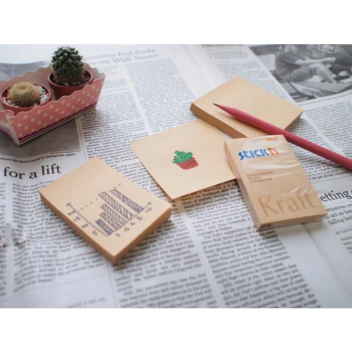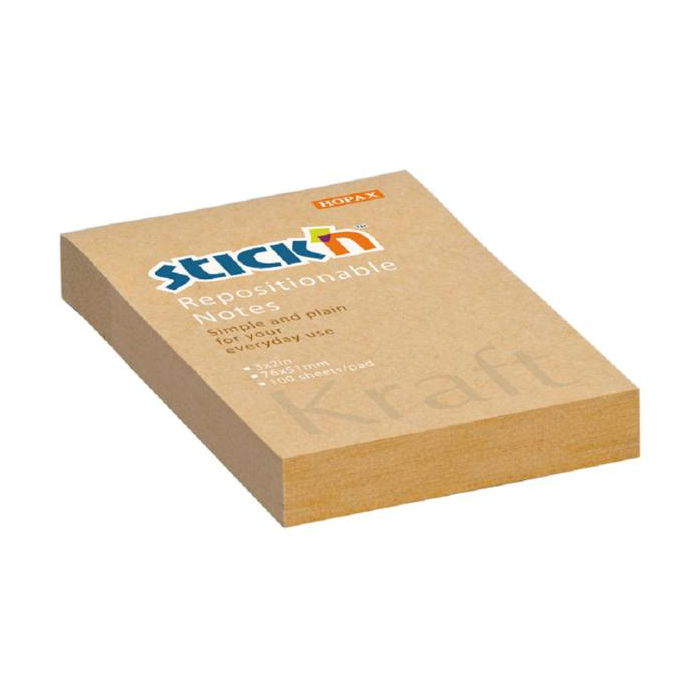 Samolepiace bločky z prírodného hnedého papiera. Sú ľahko odlepiteľné, po odlepení nezanechávajú žiadnu stopu. Väčšie balenie 12 ks.. Rozmery 76 × 51 mm. Počet lístkov 100. Farba prírodná hnedá.