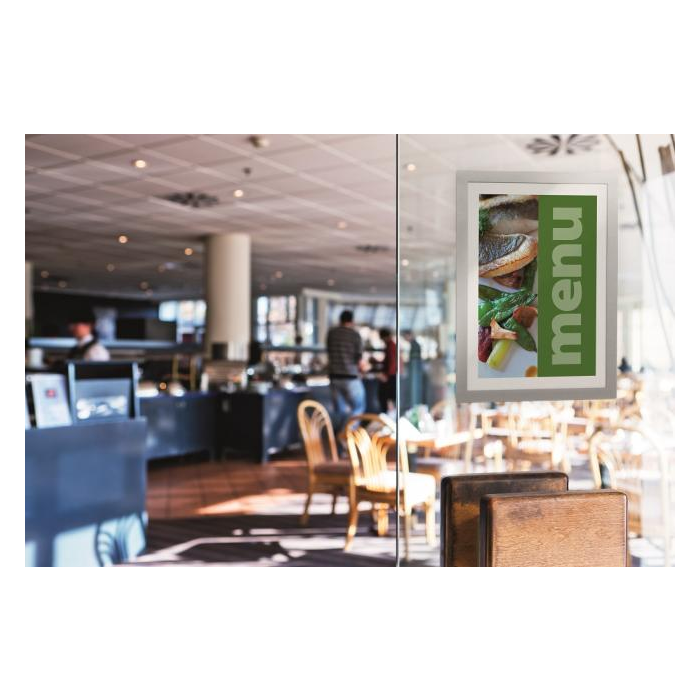 Samolepiaci informačný panel s prednou magnetickou časťou. Ideálny na vystavovanie plagátov, kľúčových informácií, špeciálnych oznamov alebo dôležitých čísel. Informácie sa ľahko vymieňajú a sú čitateľné z oboch strán, ak sa panel umiestni napr. na okno alebo priehľadné dvere. Vhodný na hladké a pevné povrchy. V prípade potreby je ľahko premiestniteľný bez potreby vŕtania. Formát A4, rámik strieborný. Balenie 10 ks.