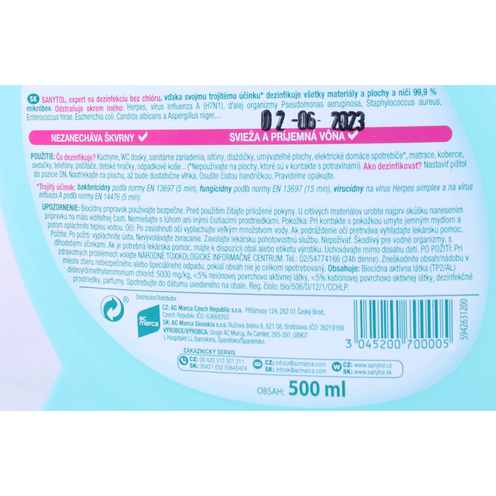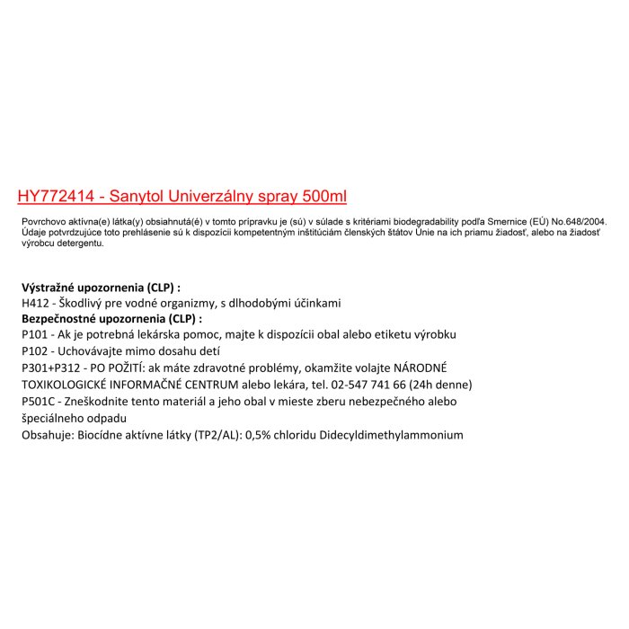 Obsahuje: Biocídne aktívne látky (TP2/AL): 0,5% chloridu Didecyldimethylammonium