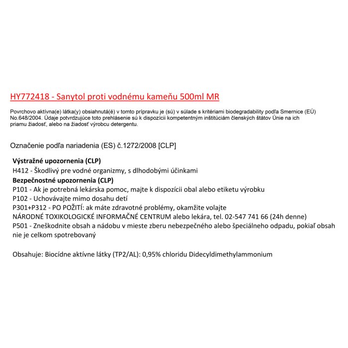 Obsahuje: Biocídne aktívne látky (TP2/AL): 0,95% chloridu Didecyldimethylammonium